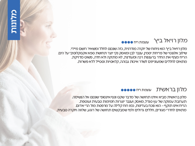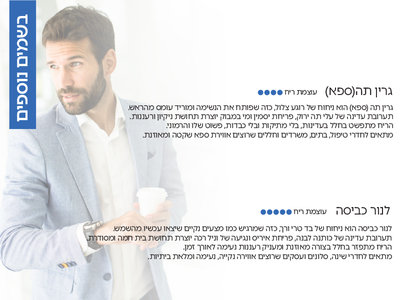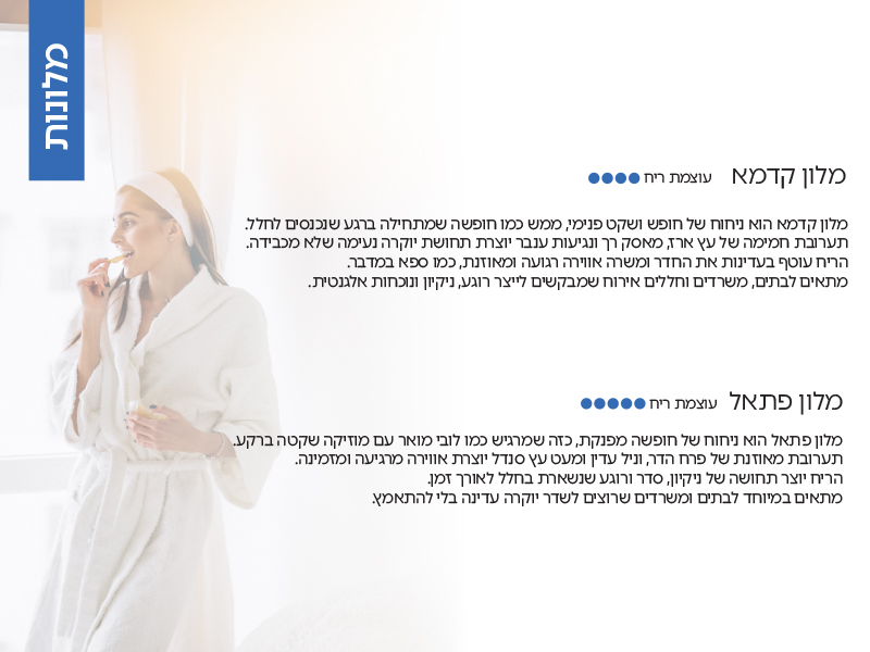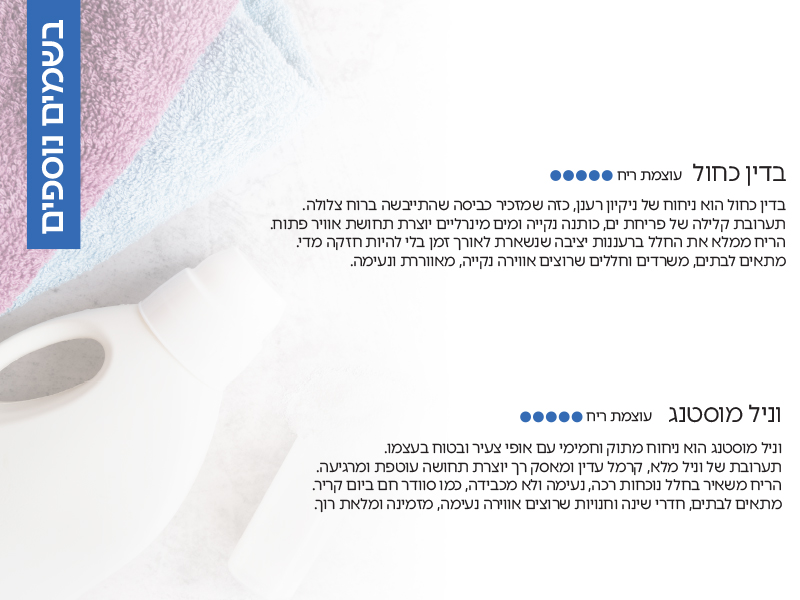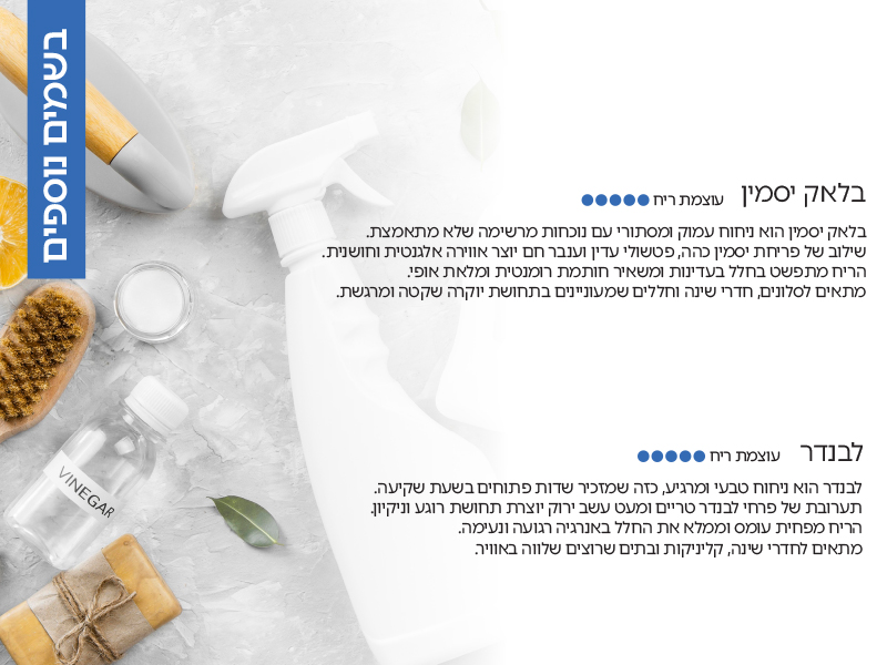 בנוסף, אנו מציעים פיתוח ריח ייחודי בהתאמה אישית לפי בקשת הלקוח.